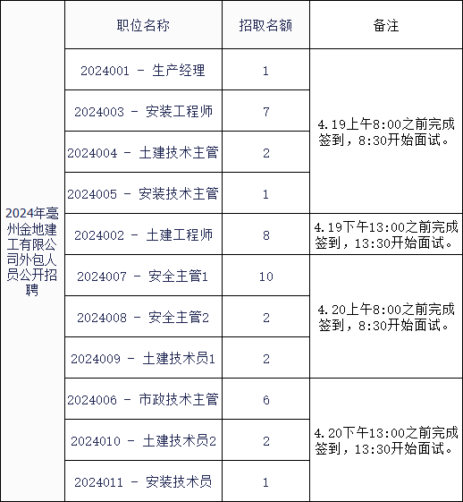 為切實做好2024年亳州金地建工有限公司外包人員公開招聘面試工作,確保面試工作嚴謹有序、客觀、公正、公開,根據《2024年亳州金地建工有限公司外包人員公開招聘》精神,制定本面試方案。