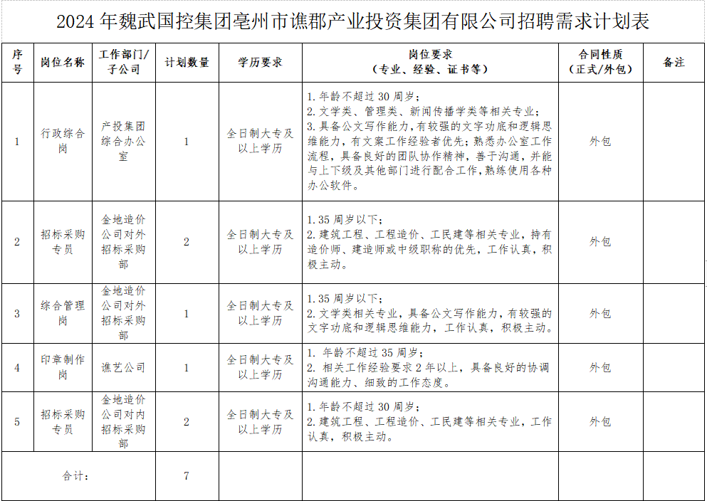 因工作需要,現(xiàn)委托亳州市譙騰人力資源管理有限公司面向社會(huì)招聘外包崗位人員7名;現(xiàn)將有關(guān)招聘事宜公告如下: